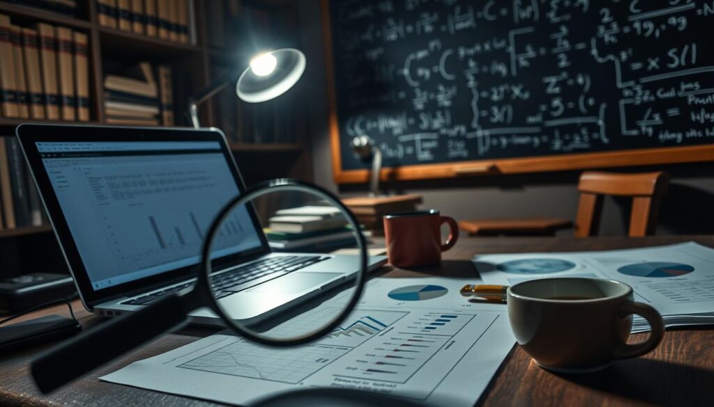 A dimly lit study desk with a laptop, papers, and a cup of coffee. In the foreground, a magnifying glass hovers over statistical charts and graphs, hinting at the meticulous analysis taking place. The background features shelves of reference books and a chalkboard covered in mathematical equations, creating an atmosphere of scholarly focus. Soft, directional lighting from a desk lamp casts shadows, emphasizing the depth and textures of the scene. The overall mood is one of thoughtful contemplation, reflecting the "Tips and Tricks to Improve the Quality of Statistical Analysis" topic.