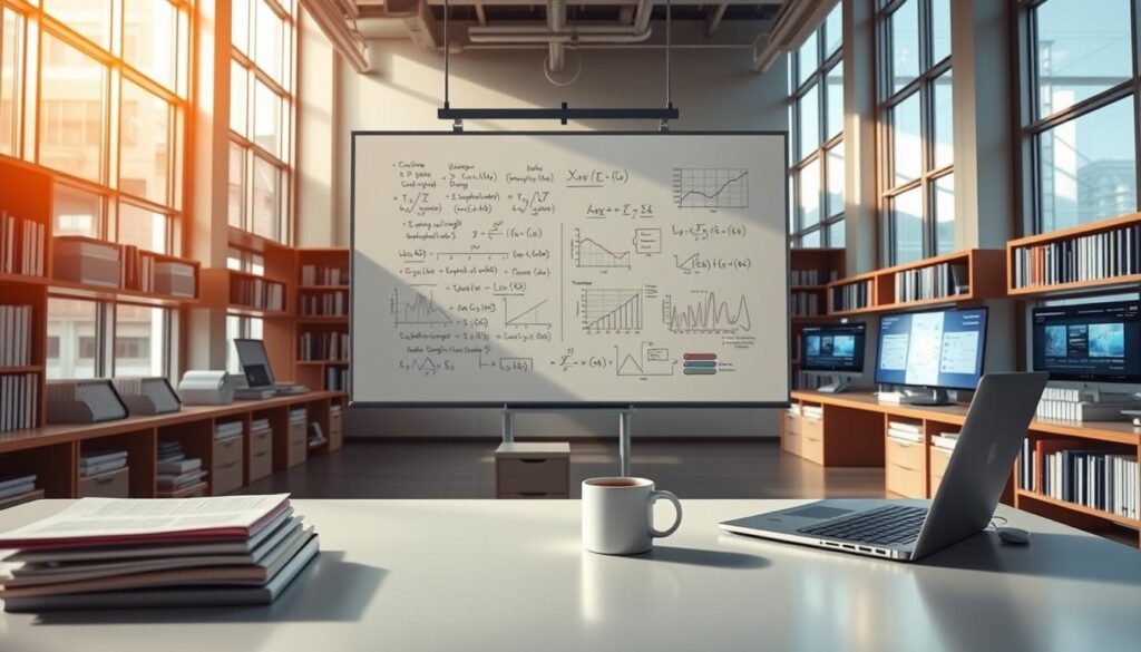 A sophisticated data analysis laboratory, bathed in warm, natural lighting that filters through large windows. In the foreground, a sleek, minimalist desk displays an open laptop, a stack of statistical journals, and a mug of steaming coffee. On the middle plane, a large whiteboard displays complex mathematical equations and visualizations, guiding the viewer through the intricacies of data analysis. In the background, rows of bookshelves and display screens showcase the latest analytical tools and software, creating an atmosphere of academic rigor and technological prowess. The overall scene conveys a sense of focus, productivity, and the pursuit of data-driven insights.