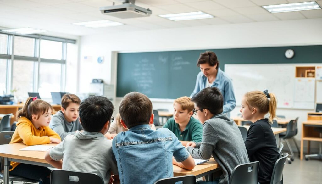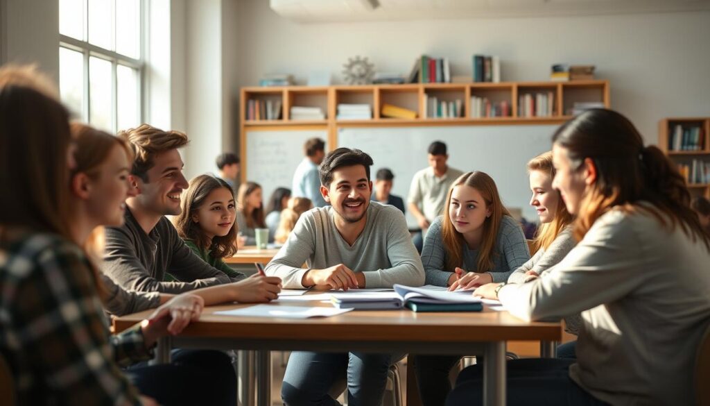 A classroom setting with students engaged in collaborative learning activities. In the foreground, a group of diverse students sitting around a table, discussing ideas and working together on a project. Soft, natural lighting filters in from large windows, creating a warm and inviting atmosphere. In the middle ground, additional groups of students are observed, their faces animated as they exchange thoughts and brainstorm solutions. The background showcases educational resources, such as whiteboards, bookcases, and learning materials, reflecting the scholarly environment. The overall scene conveys a sense of cooperation, intellectual curiosity, and a vibrant learning community.